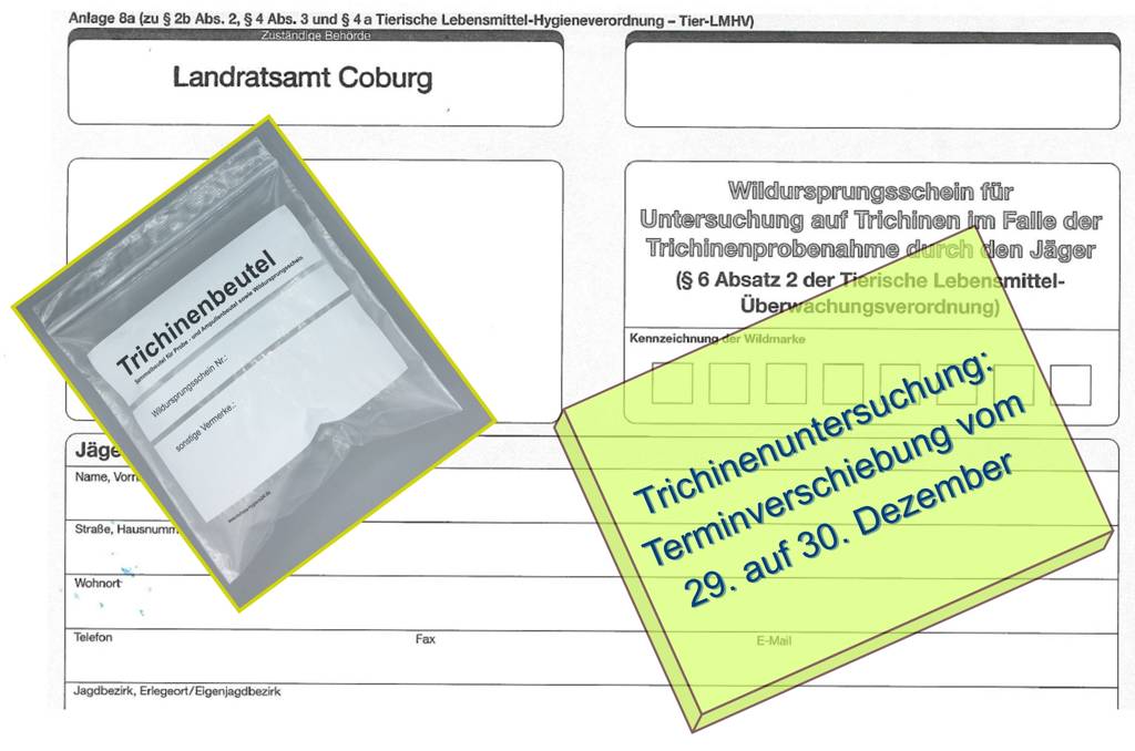 Aufgrund der Weihnachtsfeiertage wird die Trichinenuntersuchung vom 29. Dezember verschoben und erfolgt am 30. Dezember.