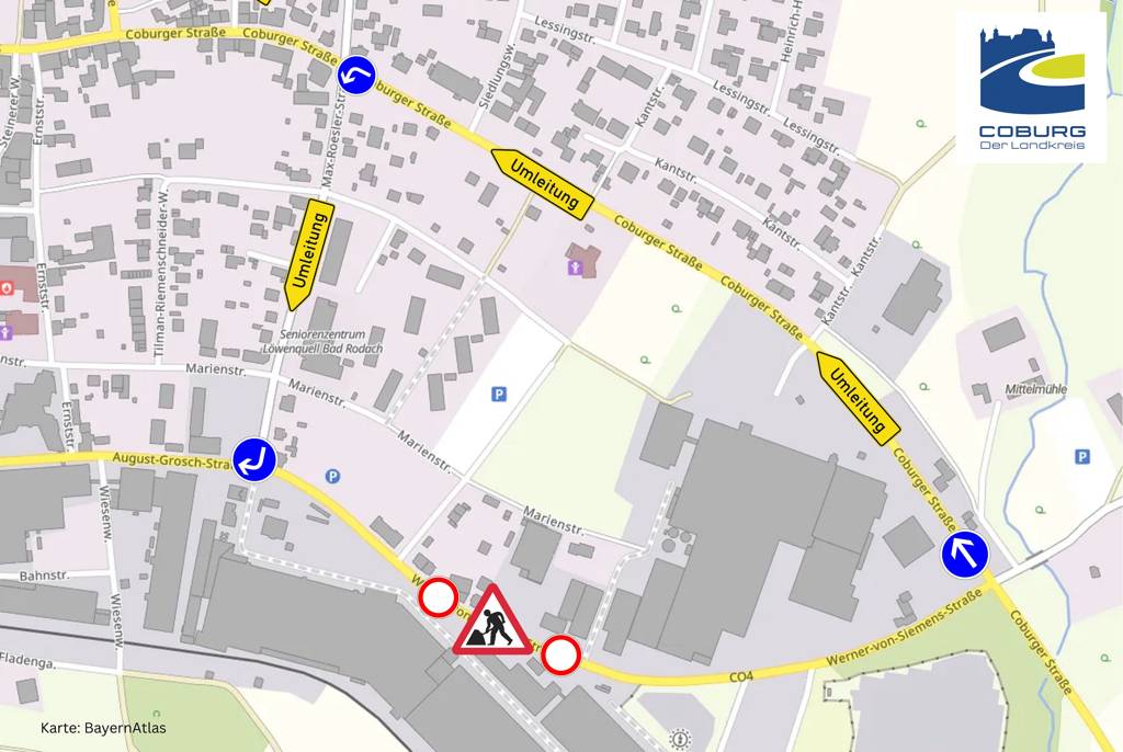 Die örtlich ausgeschilderte Umleitung für den Verkehr auf der Werner-von-Siemens-Straße, die in diesem Bereich auch Teil der Kreisstraße CO 4 ist, erfolgt in beiden Fahrtrichtungen über die Staatsstraße 2205 sowie die Max-Roesler-Straße.