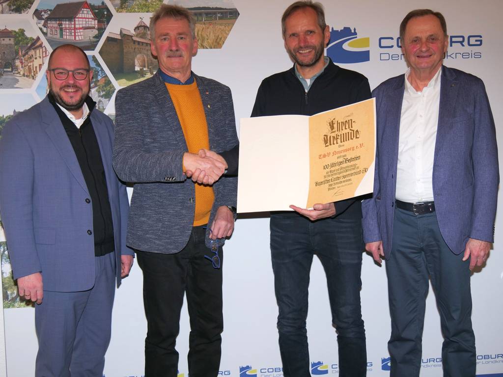 Im Nachgang der gelungenen Jubiläumsfeier im vergangenen Jahr hat der TSV seine besondere Stellung im regionalen Sport jetzt noch einmal schriftlich bestätigt bekommen: Als Vorsitzender des Coburger Kreisverbandes überreichte Eberhard Fröbel (Zweiter von links) die Ehrenurkunde „Dank und Anerkennung für hervorragende Mitarbeit“ des Bayerischen Landessportverbandes (BLSV) an den TSV Neuensorg.